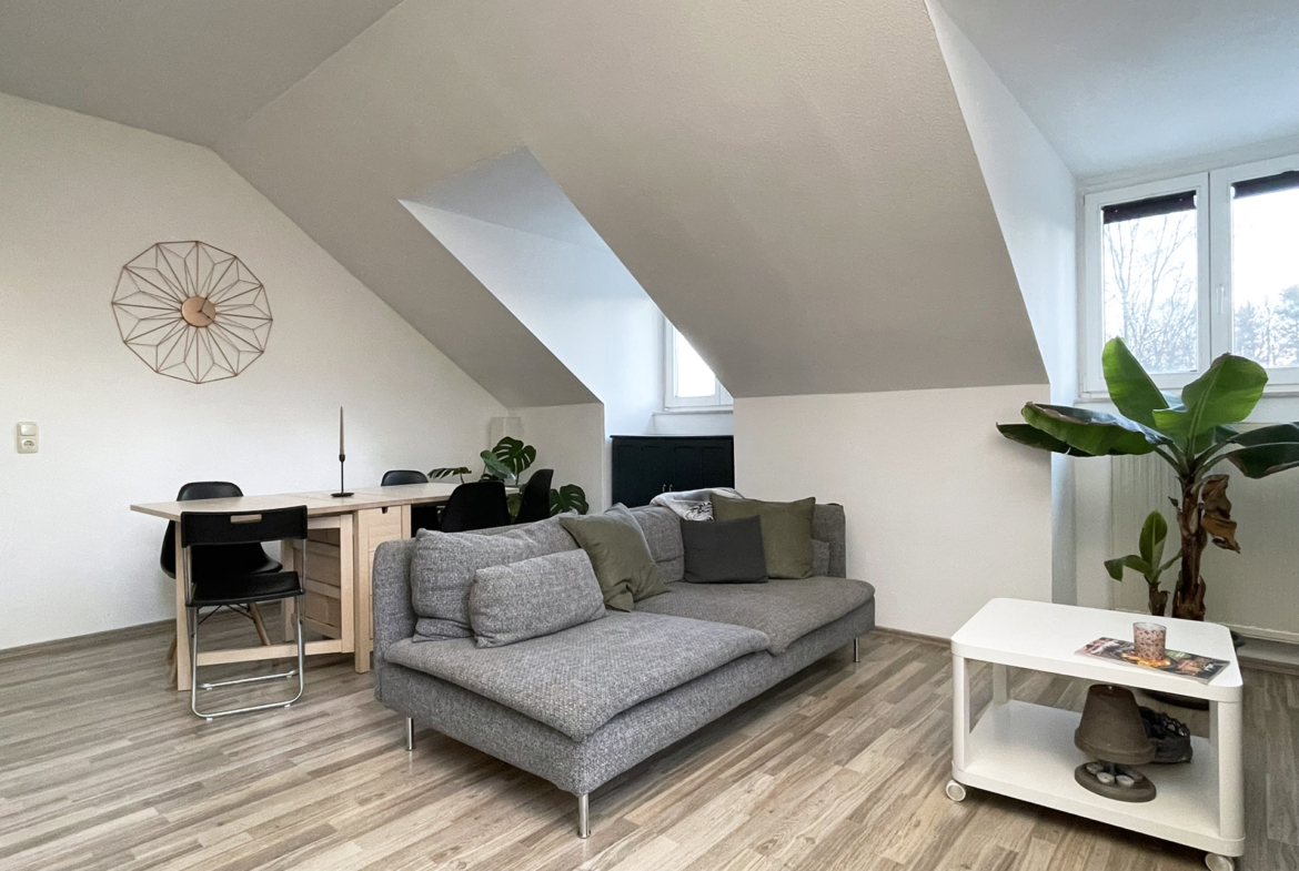Zur Vermietung steht diese schicke 2-Raum-Wohnung in Auerbach. Auf 50 m² Wohnfläche verteilen sich ein Schlafzimmer, ein Bad mit Dusche & Waschmaschinenanschluss, eine Küche, ein Wohnzimmer und der Flur. Alle Wohnräume sind mit Laminat ausgestattet, das Bad sowie die Küche mit Fliesen. Das Wohnzimmer ist der großzügigste Raum, bietet Platz für einen Esstisch und Ihre Sofaecke. Durch die Dachschrägen vermittelt das Wohnzimmer ein gemütliches Ambiente und lädt zum verweilen ein. Im Flur ist genügend Platz für ein Regal sowie eine Garderobe. Im Schlafzimmer können Sie sich neben Ihrem Schlafplatz auch eine Arbeitsecke einrichten. Die auf Bildern abgebildete Einbauküche ist nicht Teil der Vermietung und wird von den aktuellen Mietern mitgenommen.