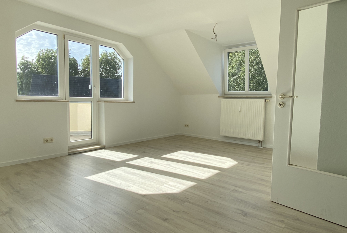 Diese 59,73 m² große 2-Raum-Wohnung besticht durch Ihre sehr ruhige Lage. Es gibt keinen Durchgangsverkehr, da das Wohngebiet am Ende einer Sackgasse liegt. Die im Dachgeschoss befindliche Wohnung wurde frisch saniert und wird erstmalig von Ihnen bezogen!